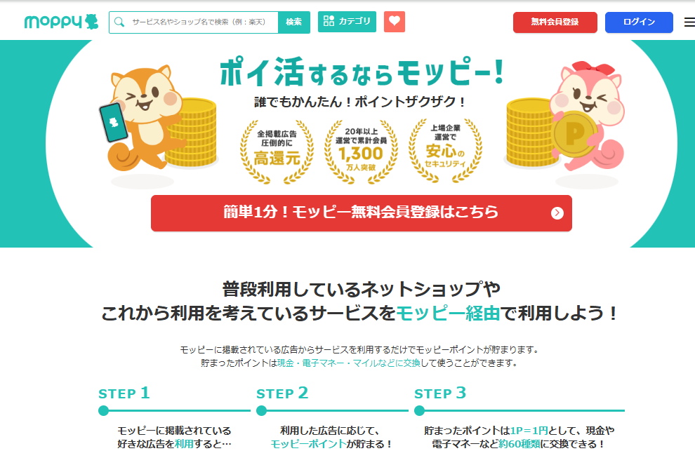 モッピー(moppy)とは、株式会社セレスが運営している日本の大手ポイントサイトのひとつです。2005年にサービス開始され、会員数は1,000万人以上を誇ります。広告利用やショッピングを通じてポイントを貯め、現金や電子マネーに換金できるお小遣い稼ぎサービスです!